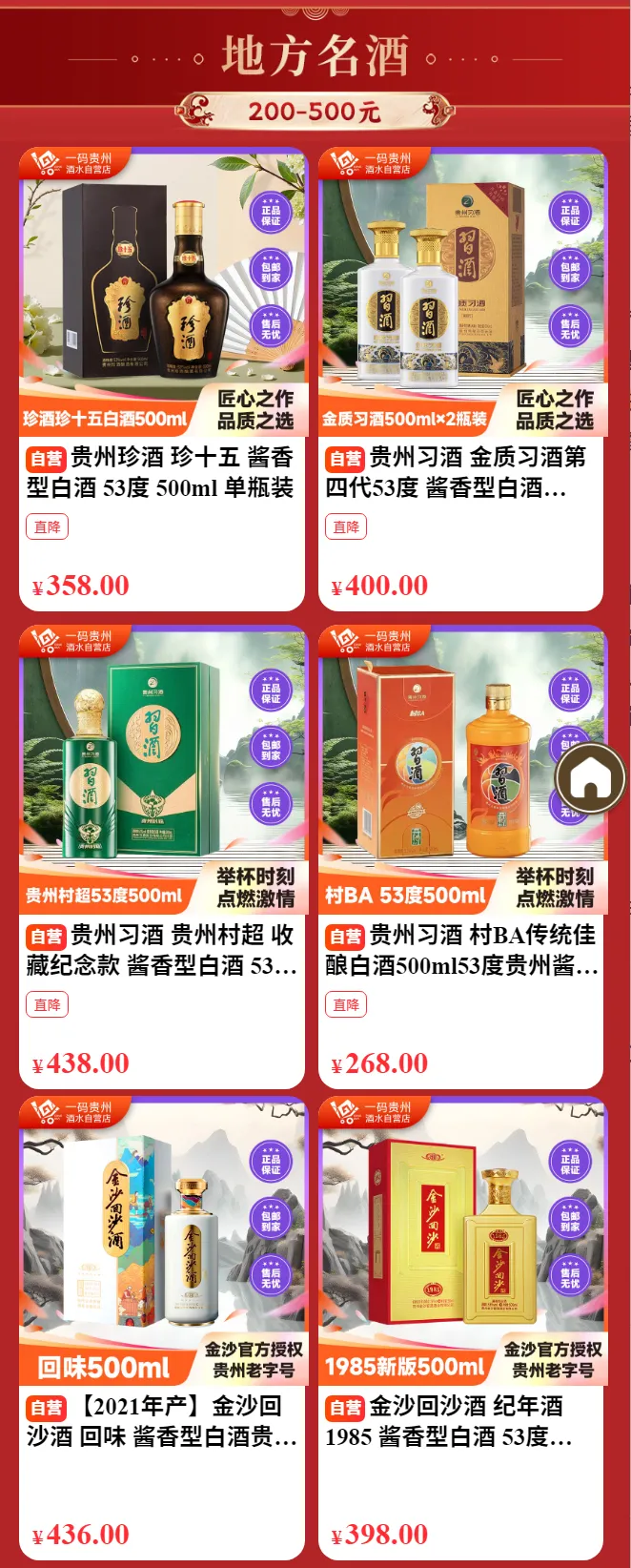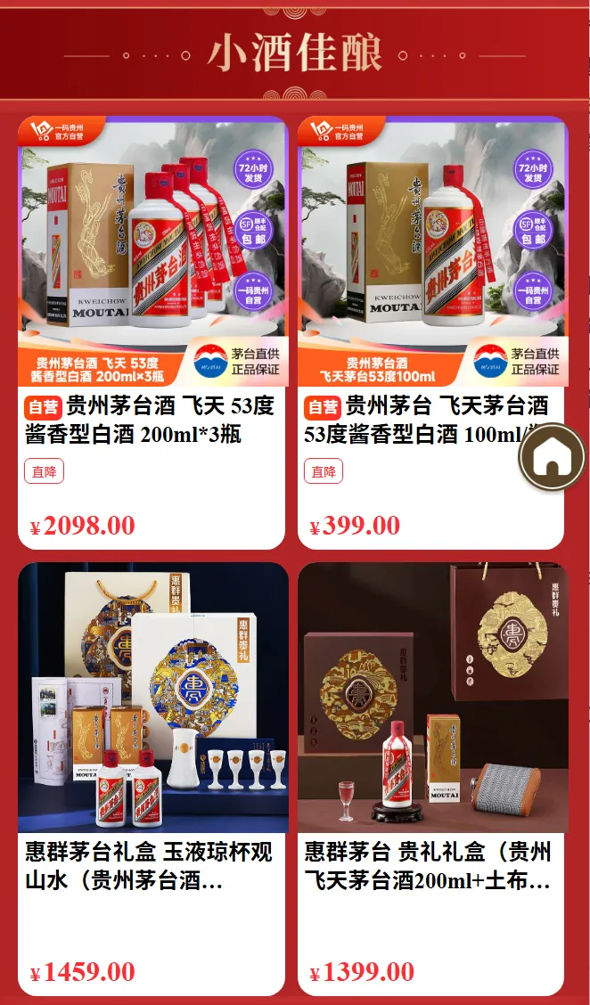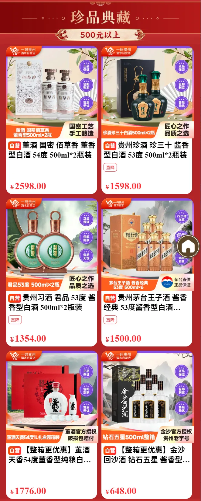 这个板块专为追求更高品质的酒友准备,所有产品均为500元以上的贵州白酒。董酒国密佰草香、珍酒珍三十、君品习酒2瓶装等。这些酒体经过更精细的工艺酿造,陈香舒适,层次丰富。自饮时细细品味时间的味道,馈赠时传递一份沉甸甸的心意。珍品典藏,给懂酒的你。