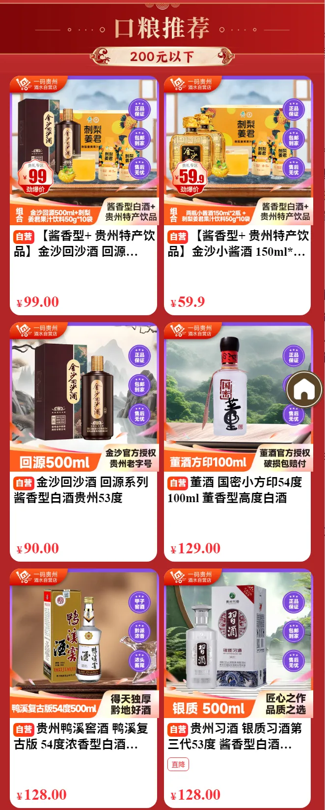 200元以内,一样能喝到正宗的贵州纯粮酒。这个板块为日常饮用提供了丰富的口粮选择:金沙回沙酒回源、金沙小酱酒、董酒国密小方印、鸭溪窖、银质习酒、平坝窖酒平安3号、平坝窖酒经典2号、董酒白标等14款白酒。它们包装简约,但酒质扎实。每天晚餐小酌一杯,或者三五好友畅饮,这些口粮酒既顺口又轻松,是酒柜里最踏实的存在。