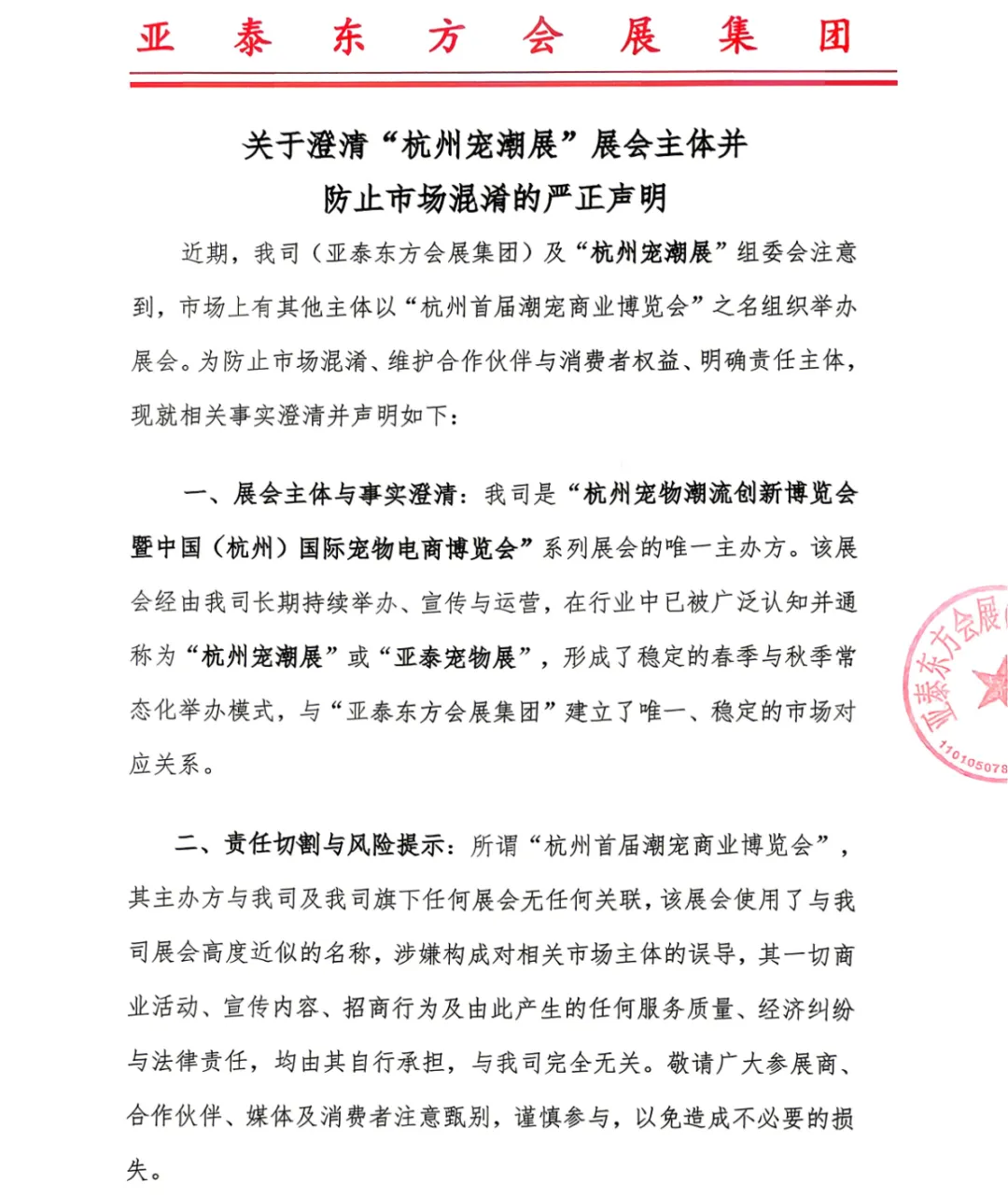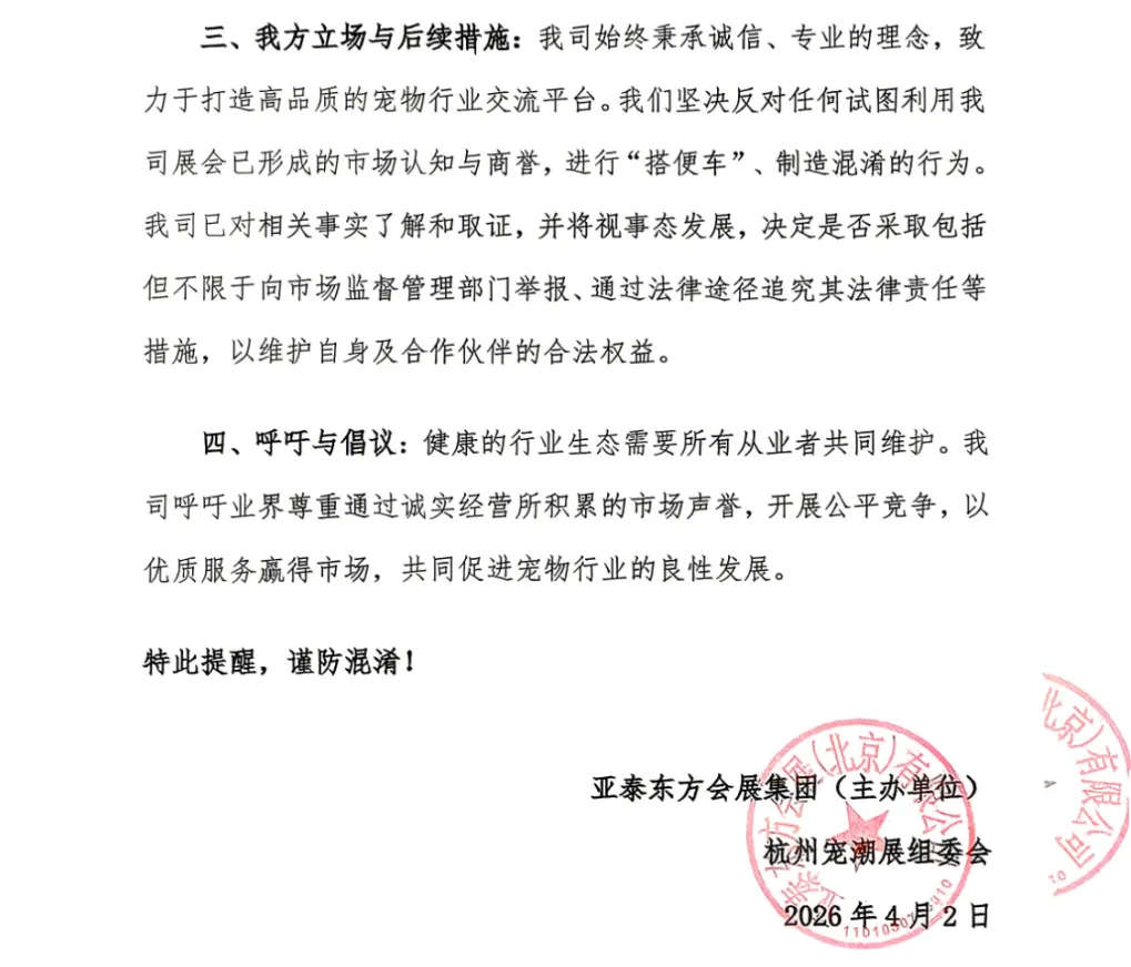 关于澄清“杭州宠潮展”展会主体并防止市场混淆的严正声明!