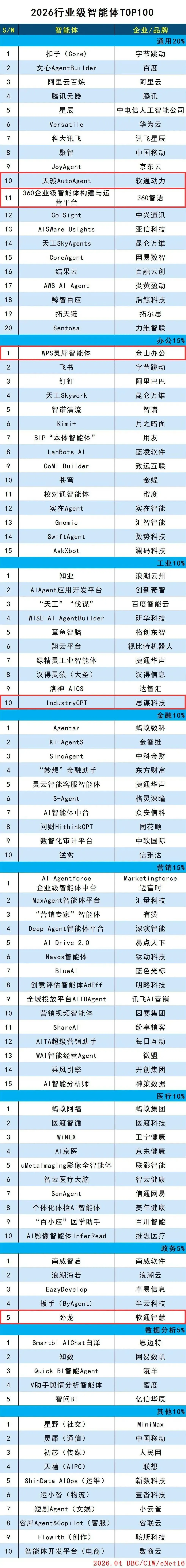 4月2日,DBC德本咨询发布了“2026行业级智能体TOP100”,北京湖北企业商会名誉会长雷军旗下金山软件、会长单位软通动力、常务副会长单位360、副会长单位思谋科技等四家企业的5个智能体登上榜单,软通动力上榜两款智能体。