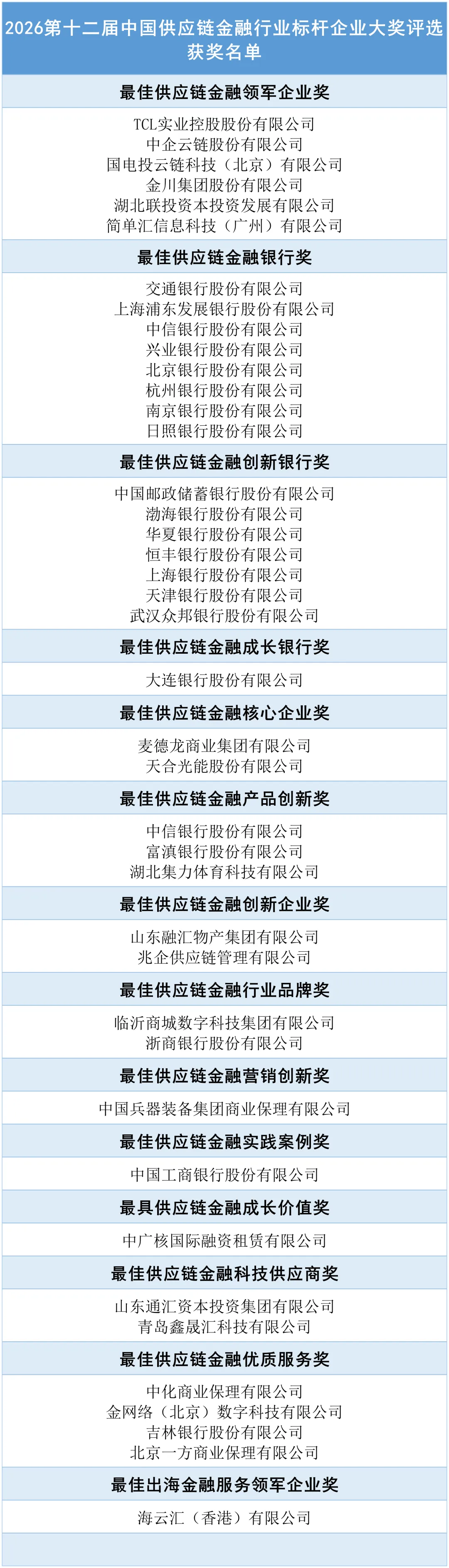 2026第十二届中国供应链金融行业标杆企业大奖评选获奖名单公示(排名不分先后)