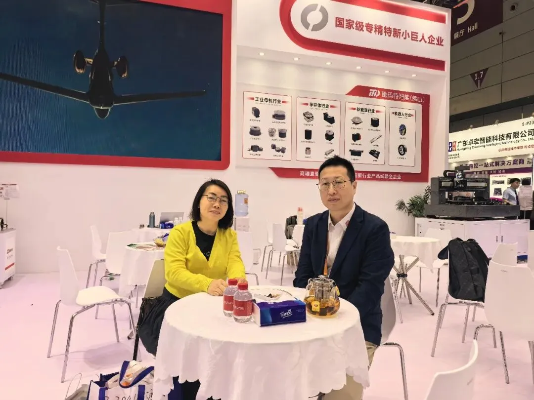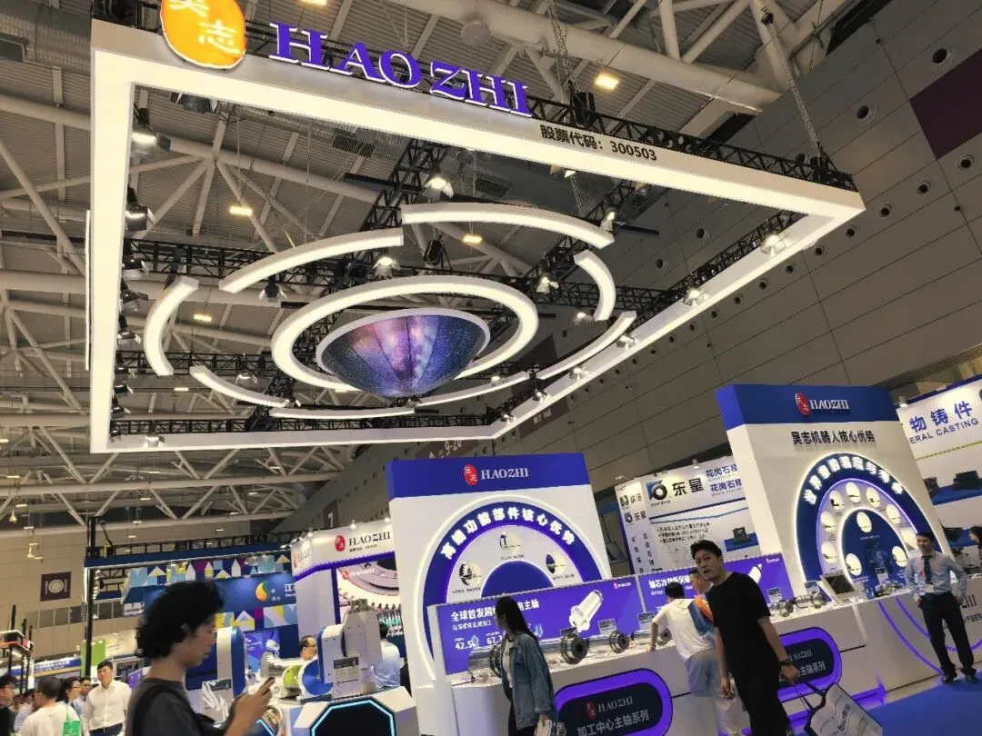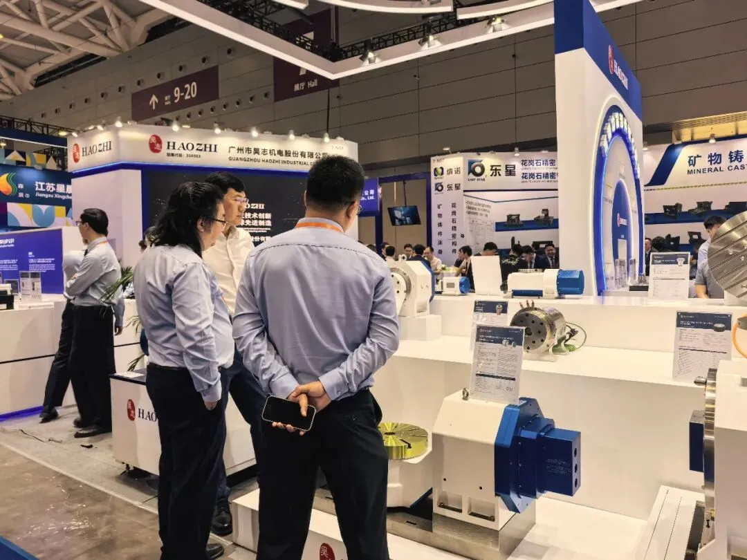 副会长单位昊志机电展示出了电主轴、转台、工业协作机械臂、自动化夹具、传感和控制系统等多款创新产品振撼亮相,具有高加工精度和稳写的加工品质等优势。孟治国总监和客户相谈甚欢。