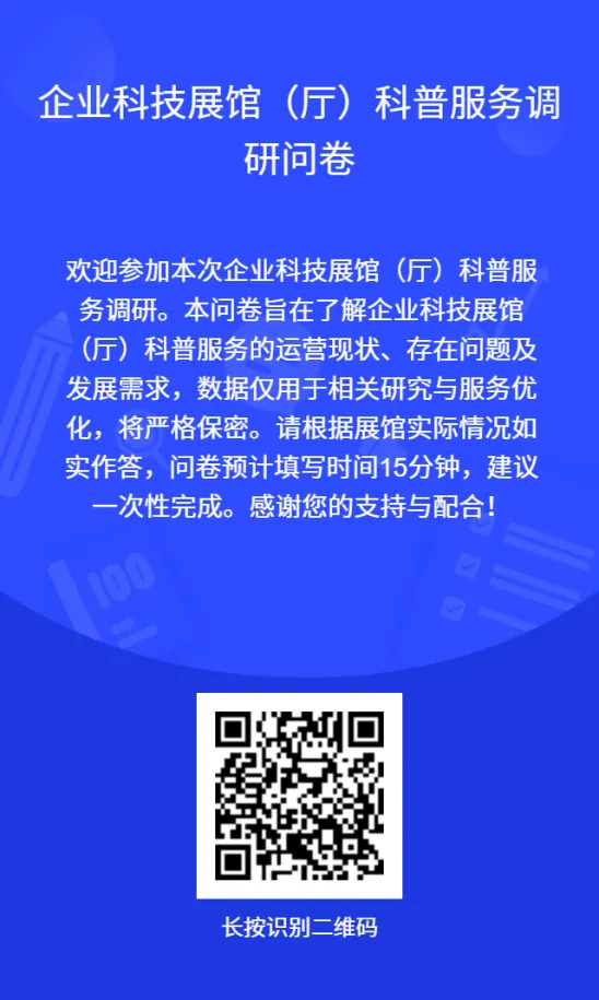 您的真实反馈,将推动企业科普服务更规范、更普惠、更高效。诚邀各企业相关负责人如实填写问卷,共绘企业科技展馆高质量发展蓝图!