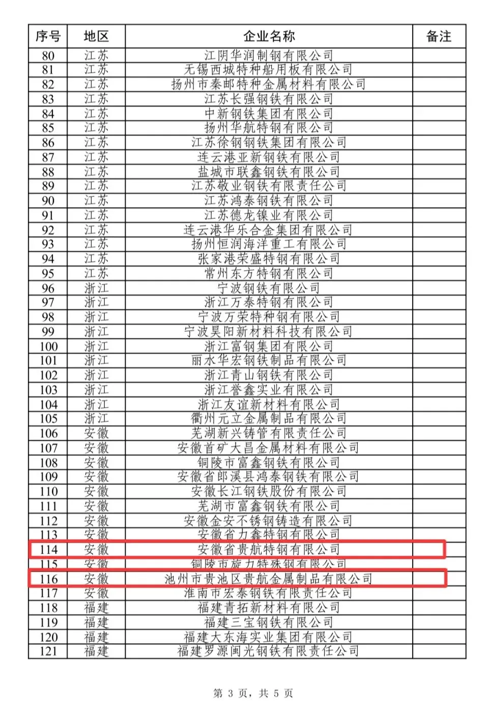 日前,工业和信息化部发布公告对符合《钢铁行业规范条件(2025年版)》的“规范企业”(第一批)名单予以公示,我区安徽省贵航特钢有限公司、池州市贵池区贵航金属制品有限公司2家企业成功入选。