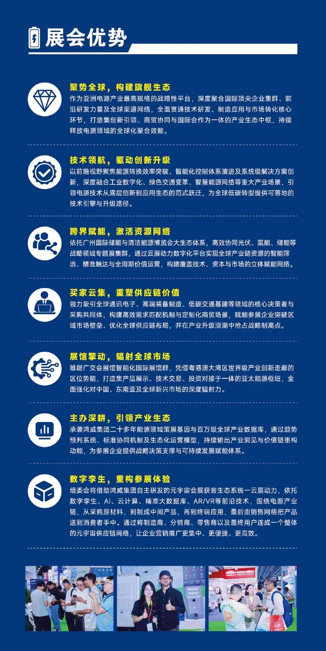 面向全球顶级采购商、专业买家团体、政府机构及主流媒体,构建品牌全球影响力的战略高地,世界电源产业博览会提供集中展示企业实力与创新成果的展示窗口,助力在全球产业格局中树立卓越形象、提升国际声誉。