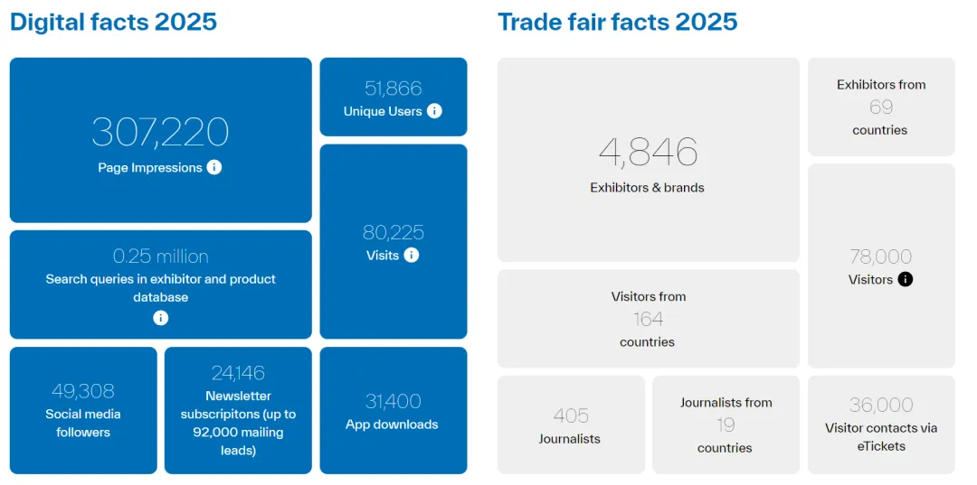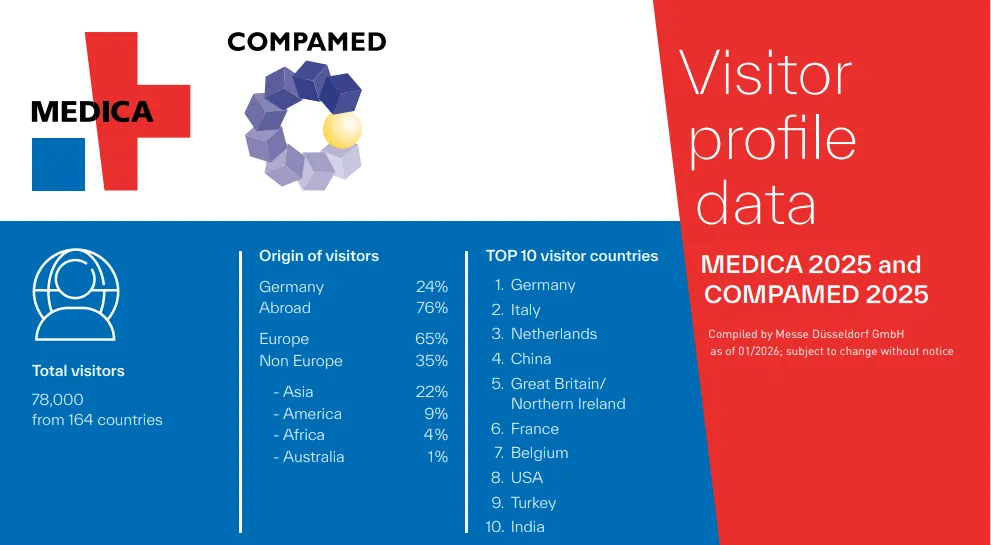 2025 年MEDICA于11 月 17-20 日在德国杜塞尔多夫举办,作为全球规模最大、医疗行业影响力首屈一指的 B2B 专业展览会,本届展会汇聚全球医疗产业核心资源,成为国际医疗技术交流与商贸对接的顶级平台。吸引70 个国家的 5584 家展商同台亮相,迎来164 个国家和地区的 78,000 名专业观众到场参观,其中四分之三为企业和机构管理层,具备直接采购决策能力,海外观众占比高达 75%。