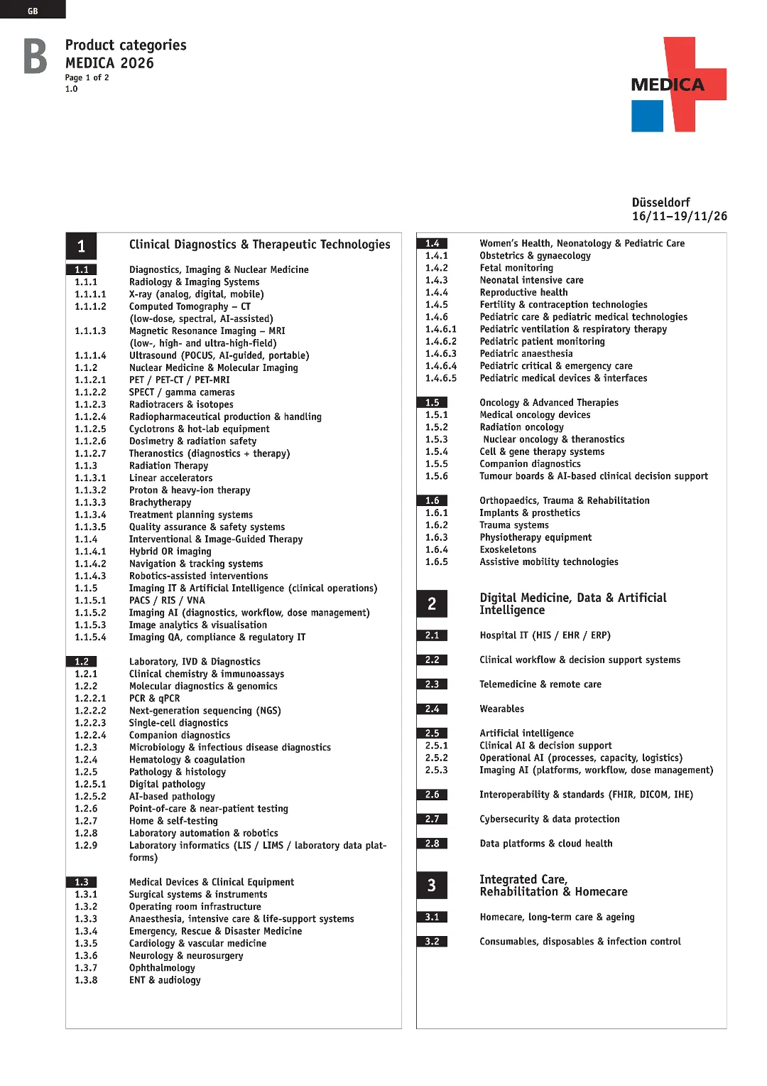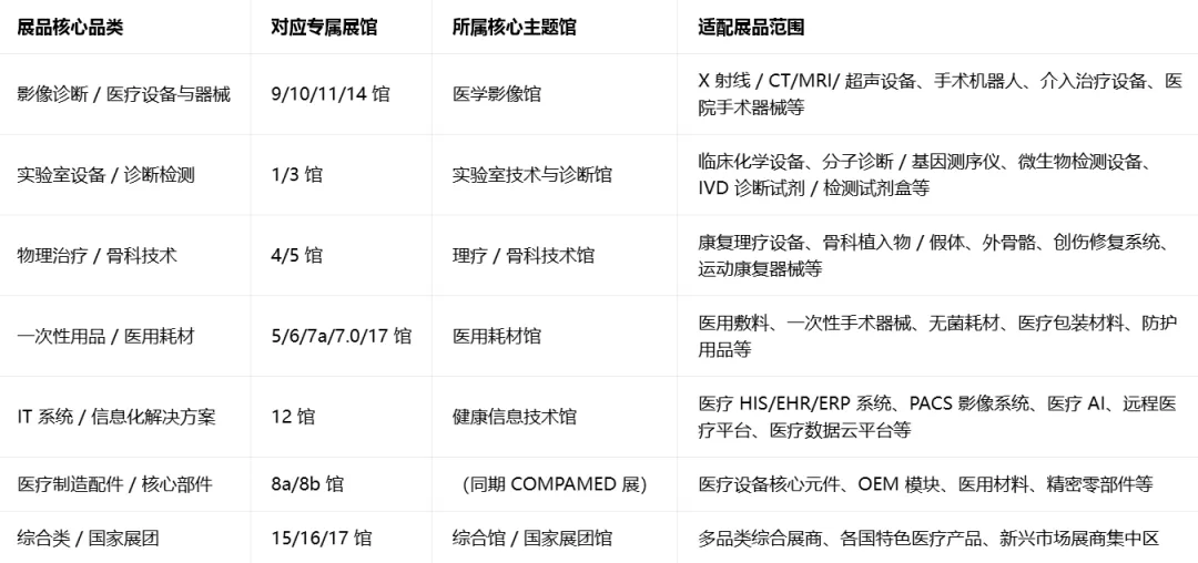 2026 年 MEDICA 展会将核心展品划分为六大品类,并对应杜塞尔多夫展览中心1-17 号馆专属展区,同时设五大核心主题馆,同品类展品集中布局,最大化实现精准买家对接,具体展品 - 展馆对应关系如下