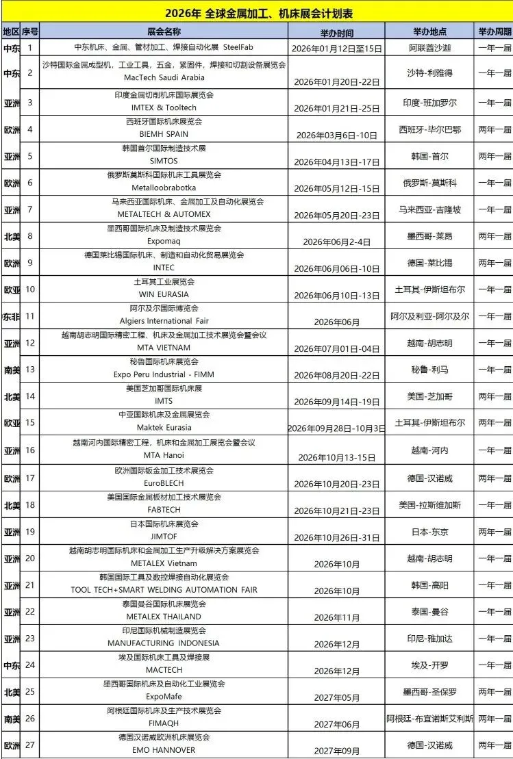 2026年全球机床金属加工展会清单