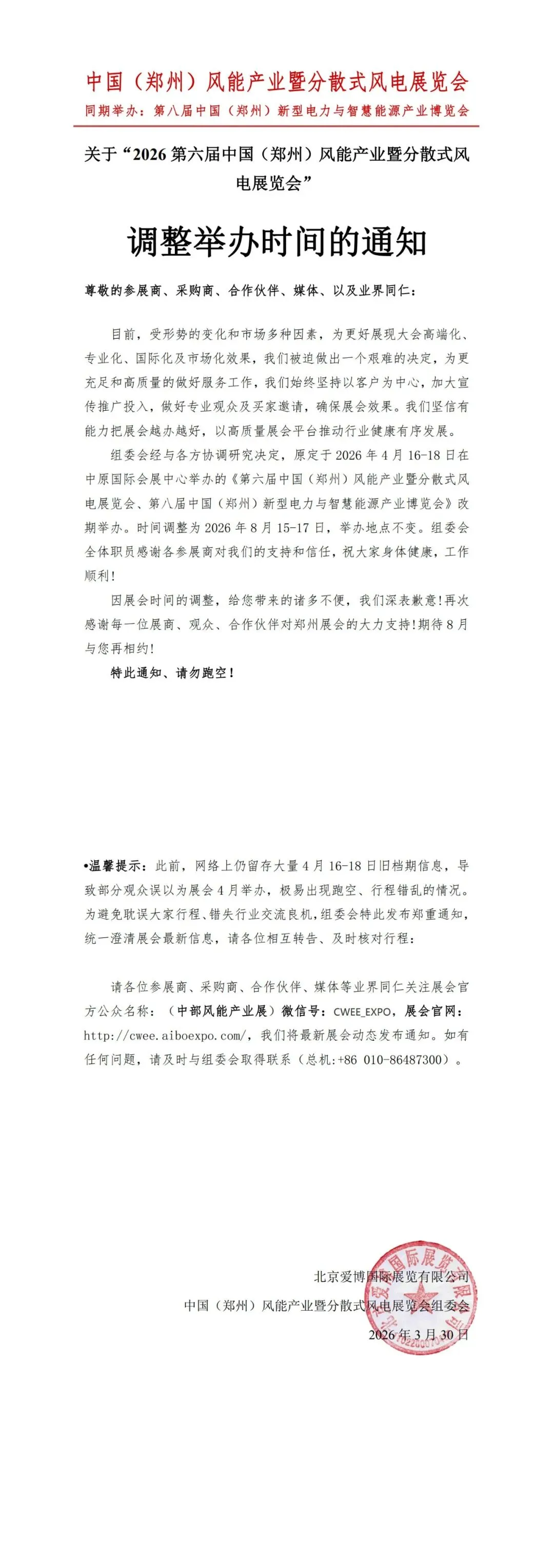 关于“2026第六届中国(郑州)风能产业暨分散式风电展览会”调整举办时间的通知