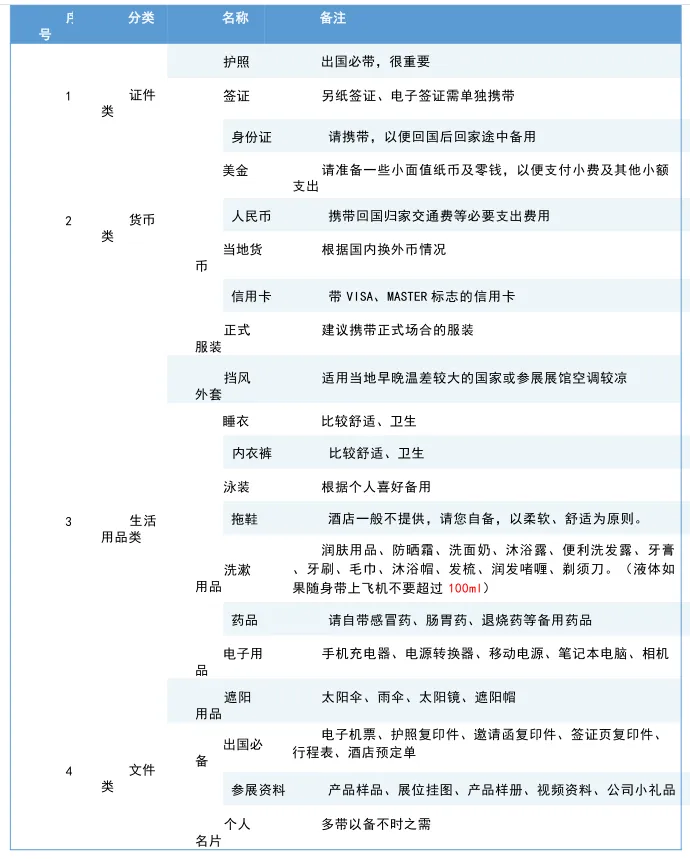 【出国参展个人物品准备清单】