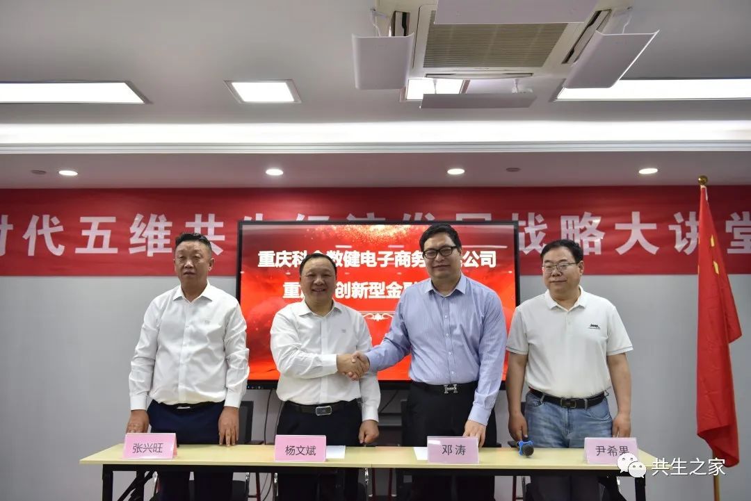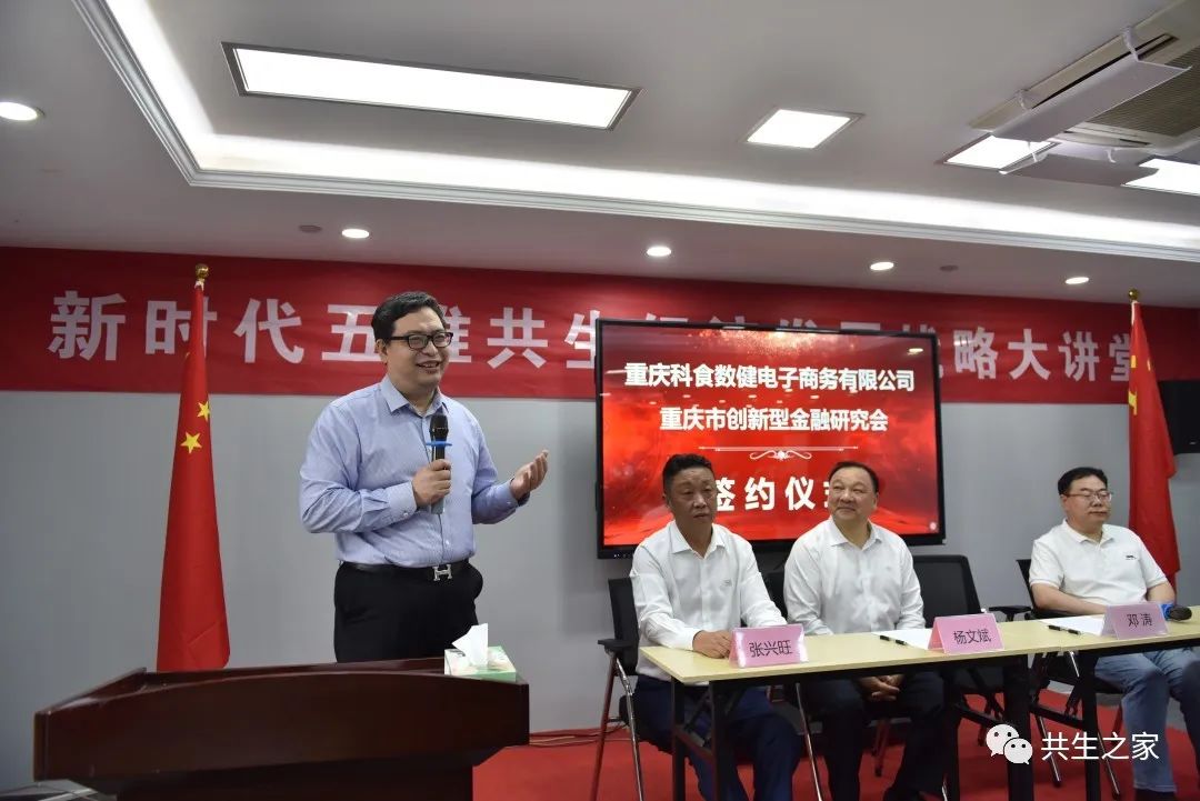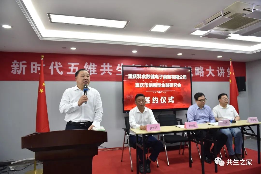5月6日上午,重庆市创新型金融研究会理事长邓涛博士与重庆科食数健电子商务有限公司总裁杨坤运先生签署联合成立“五维共生经济研究中心”(简称“研究中心”)合作协议。签字仪式由研究中心执行主任吴健主持,出席和见证签字仪式的嘉宾有其雨集团董事长张兴旺先生、其雨集团执行总裁崔文杰先生、研究中心专家尹希果教授以及参加五维共生经济发展战略大讲堂的学员们。