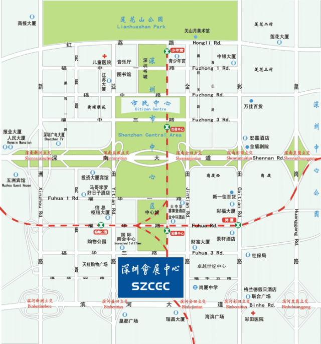 广州方向接驳:上广深高速→福田出口下高速→滨海大道(罗湖方向)→益田立交左转益田路→福华三路右转抵达展馆。