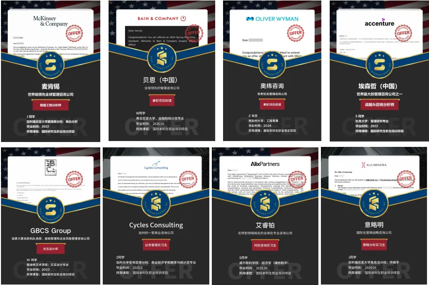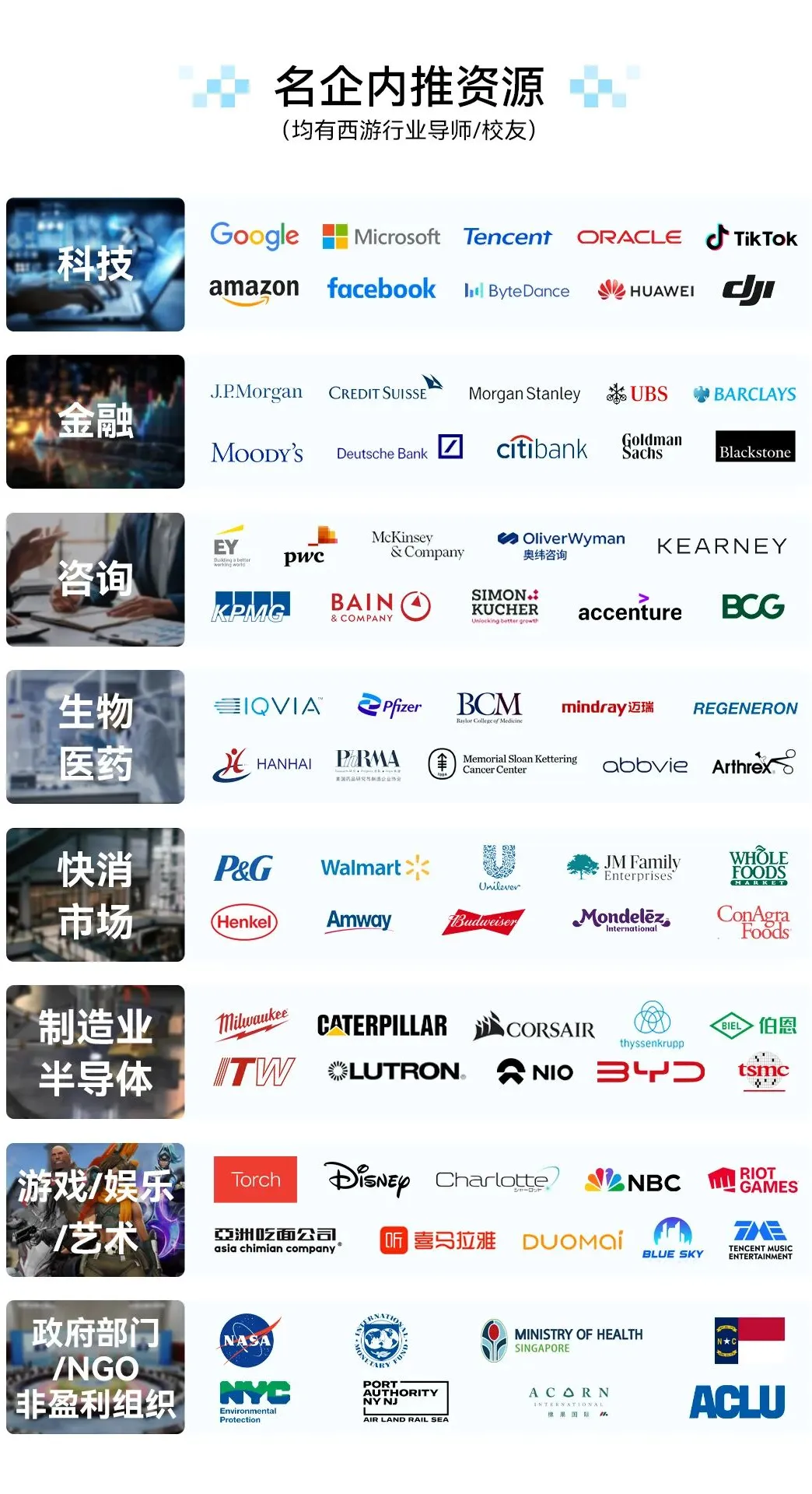 涵盖:科技、金融、咨询、快消、生物医药、工程、艺术等行业