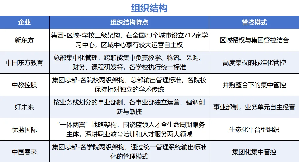 第一,组织架构趋向专业化与敏捷化。新东方的区域授权与集团管控结合、好未来的事业部制、东方教育的标准化集权管控、优蓝国际的生态化平台型组织,各企业根据业务特点构建适配的组织形态,不再简单追求规模扩张,而是强调管控效率与市场响应的平衡。