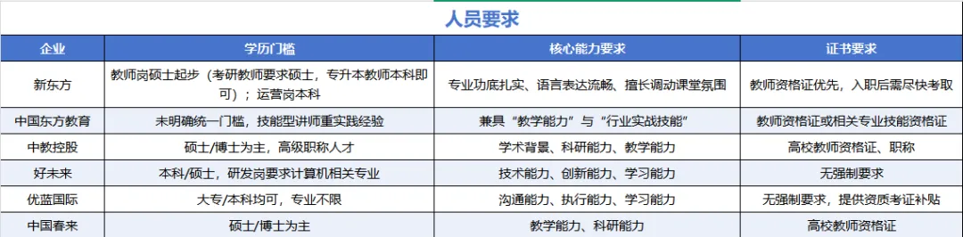 第五,合规管理成为人力资源核心职能。东方教育招股书将“教师资质”列为重大风险因素,中教控股对高校教师资格证和职称的严格要求,新东方对教师资格证的优先考虑,都反映了行业合规化进程对人力资源管理提出的新要求。教师资格证、专业技能资格证等合规要求,已成为企业经营的生命线。