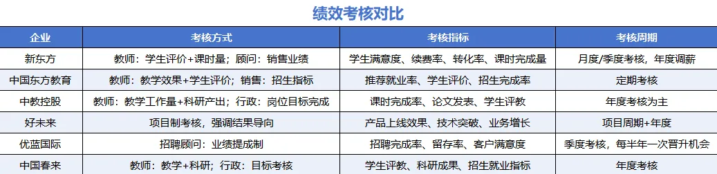 新东方将学生评价与教师收入直接挂钩,形成了市场化的竞争机制。教师考核以学生满意度、续费率、转化率、课时完成量为核心指标,顾问考核则以销售业绩为导向。