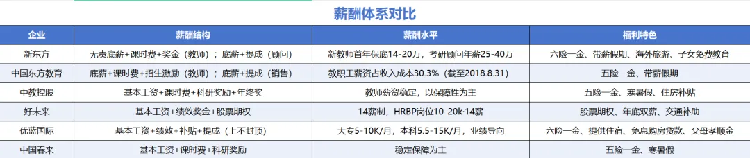中国春来采用基本工资+课时费+科研奖励的薪酬结构,以稳定保障为主,福利包括五险一金、寒暑假,与中教控股类似,体现了高等学历教育对师资队伍稳定性的重视。