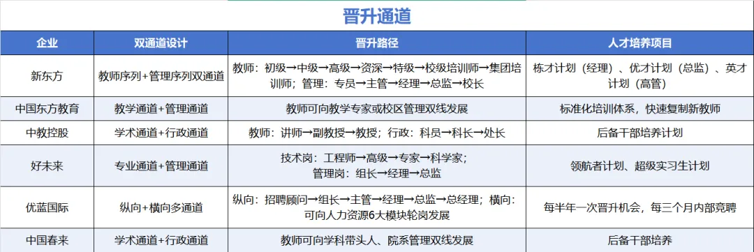 第四,晋升通道设计更加系统化。新东方的“栋才-优才-英才”三级人才培养体系、优蓝国际的“每半年一次晋升”机制、好未来的“领航者计划”、东方教育的标准化复制培训体系,都体现了企业对人才梯队的战略性投入。