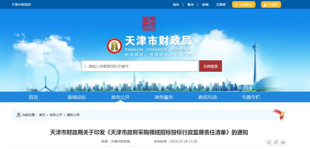 为深入贯彻《国务院办公厅关于创新完善体制机制推动招标投标市场规范健康发展的意见》和《国务院办公厅关于印发〈政府采购领域“整顿市场秩序、建设法规体系、促进产业发展”三年行动方案(2024—2026年)〉的通知》精神,强化政府采购领域招标投标活动监管,天津市财政局于近日印发《天津市政府采购领域招标投标行政监督责任清单》(简称《清单》)。