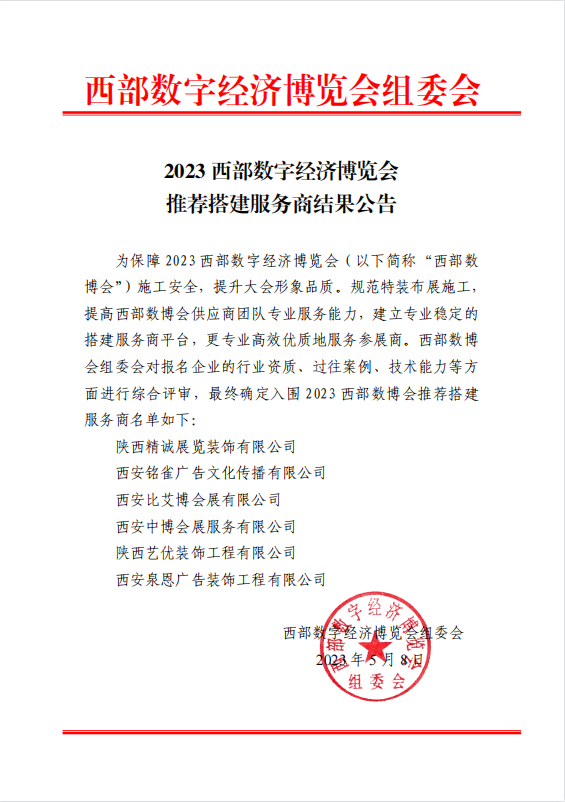 西部数博会组委会对报名搭建商的行业资质、过往案例、技术能力等多方面进行综合评审,最终确定入围第四届西部数字经济博览会推荐搭建服务商名单如下。