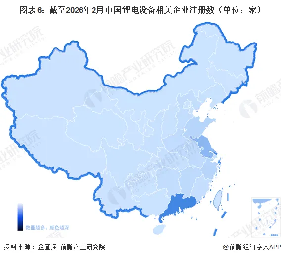 在区域发展方面,根据中国企业大数据平台企查猫的数据,截至2026年2月末,中国锂电设备行业注册企业数量的区域分布如下所示。其中,广东省内拥有的锂电设备行业企业数量最多,其次是江苏省。此外,山东省、浙江省、河北省等区域也有一定数量的锂电设备企业分布。