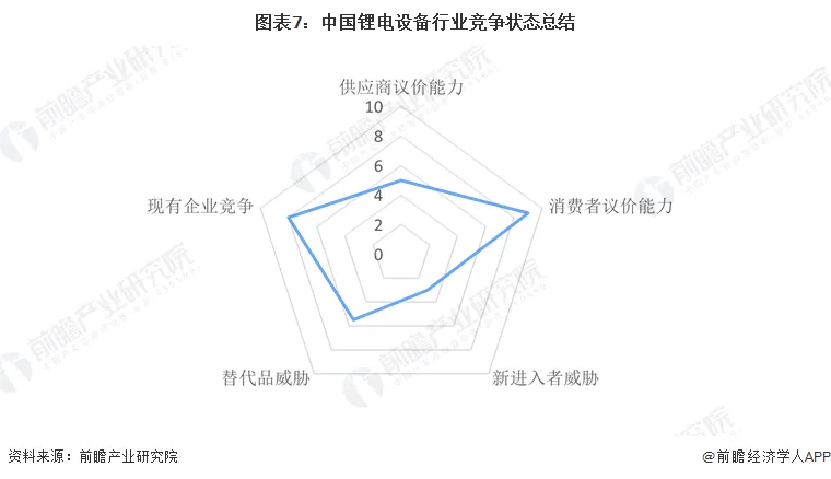 从五力竞争模型角度分析,我国锂电设备行业上游部分高精密设备或零件国产化程度较低且定制化程度较高,但整体零部件或原材料供应能力充足,因此供应商议价能力一般;锂电设备市场需求空间较大,但下游锂电制造行业竞争格局较为稳定,行业集中度较高,且对锂电设备的研发方向和需求具有决定性的影响力,因此购买者议价能力较强;锂电设备行业对潜在进入者的吸引力虽然较大,但面临着资金、技术、人才等高壁垒,综合来看,行业潜在进入者威胁较低;锂电设备是锂电池制造的重要环节,在多个领域应用程度较深,在新能源汽车、储能等领域的需求空间将逐渐扩大,但长期来看目前行业最大下游新能源汽车领域可能面临技术方向的转变(专项氢燃料电池)因此,行业替代品威胁存在但相对较低;此外,我国锂电设备行业处于成长期到稳定期的阶段,行业内现有竞争者竞争激烈程度逐渐趋于稳定。