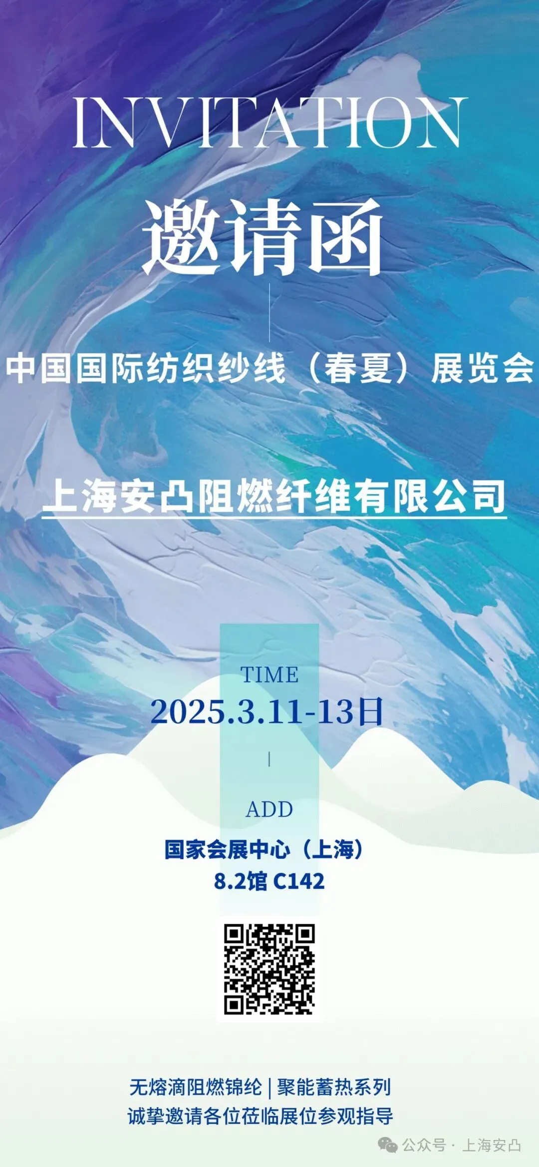 作为专业从事功能性纤维(阻燃,保暖蓄热)研发、生产、销售的公司,上海安凸一直不断优化产品、促使用户需求得以满足。本次纱线展,上海安凸将在8.2馆C142展区展出无熔滴、混纺型阻燃锦纶系列&高强阻燃锦纶长丝以及高性能聚能蓄热保暖材料。