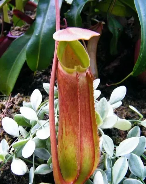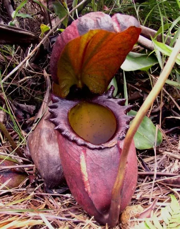 猪笼草的捕虫笼由卷须末端特化而成,这个形似小笼子的结构本质是变态叶片,笼盖并不会主动闭合,其腹面能分泌带有蜂蜜香味的蜜汁,如同陷阱旁的诱饵,持续吸引蚂蚁、苍蝇等小型昆虫。当昆虫被香味引诱至笼口时,光滑的笼口边缘会让它们瞬间失去着力点,失足坠入笼底。笼内底部储存着由消化腺分泌的酸性消化液,不仅能淹死猎物,还能将其分解为氨基酸、氮素等小分子物质,最终被笼壁细胞吸收,转化为生长所需的营养。