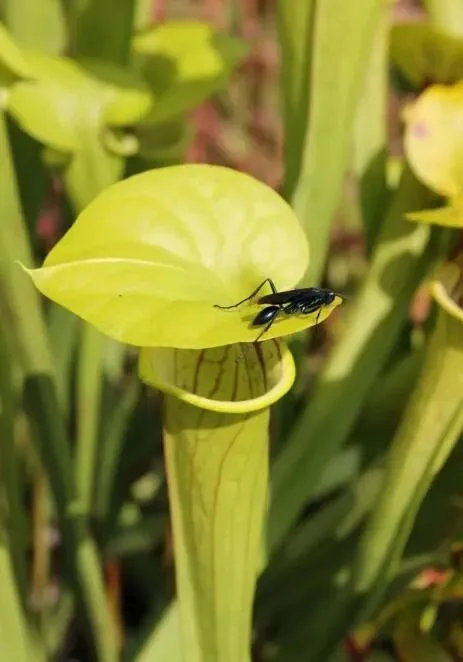 来自美洲大陆沼泽地带的瓶子草因外形与猪笼草相似却分属不同科属而备受关注。它的叶片呈现“分工合作”模式:一部分是正常的剑形叶,负责光合作用制造有机物;另一部分则特化为筒状的“捕虫瓶”,专职捕猎。这些“瓶子”色彩艳丽,有的呈鲜红带斑纹,有的泛着淡绿荧光,还会根据种类不同散发紫罗兰香或水果甜味。昆虫被视觉与嗅觉双重信号吸引,一旦飞入“瓶”内,就会被内壁向下生长的细密倒毛挡住退路——这些倒毛柔软且方向单一,昆虫往上爬时会不断打滑,最终落入瓶底的消化液中。有趣的是,部分瓶子草自身不分泌消化酶,而是与蚊子幼虫、细菌形成共生关系:蚊子幼虫以落入瓶中的昆虫为食,其排泄物经细菌分解后,便成为瓶子草可吸收的“营养餐”,实现了三方共赢。