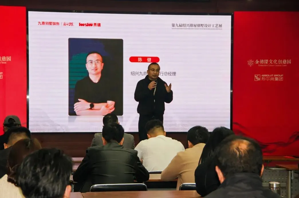 绍兴九鼎装饰执行总经理陈健发表讲话,叮嘱大家要敬畏这个行业,把每一个细节做扎实;肯定了之前演讲比赛的效果,也明确了2026年“品质九鼎”的创新规划。