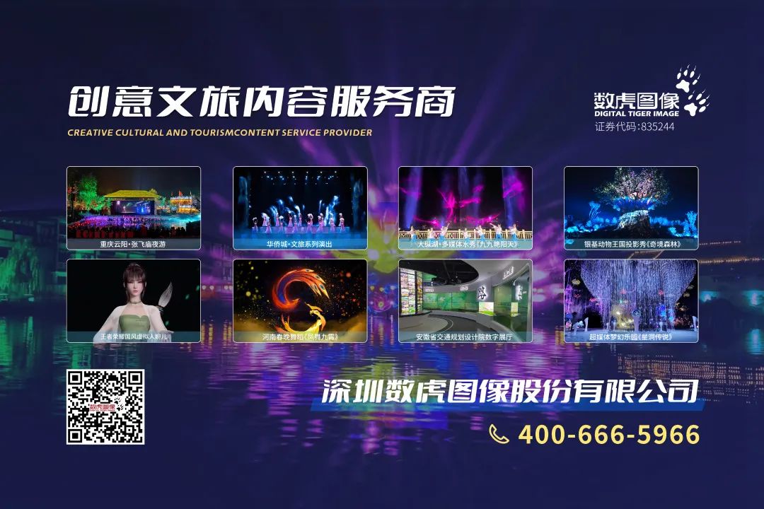 深圳数虎图像股份有限公司(简称:数虎图像,证券代码:835244)总部设于深圳,并在北京、上海、西安、武汉、贵阳分别设有分支机构。深耕于视觉创意领域,专注大型文旅项目定制开发,聚焦文化旅游、新媒体艺术,全面发挥科技+艺术+创意的核心竞争力,致力于成为中国高科技创意文旅的内容服务商。围绕旅游景区、文旅综合体,打造以演出为核心的沉浸式互动体验产品及服务。业务涵盖虚拟制作、旅游演艺、综艺节目、夜游、大型活动、灯光秀、水秀、体验展馆、DT儿童剧、光影乐园、兔子庄园等。迄今,已成功服务于宋城演艺、华侨城演艺、万达(融创)文旅、华谊兄弟、陕文旅、新华联、阳光传媒、中央电视台、湖南卫视等,获得客户一致好评。