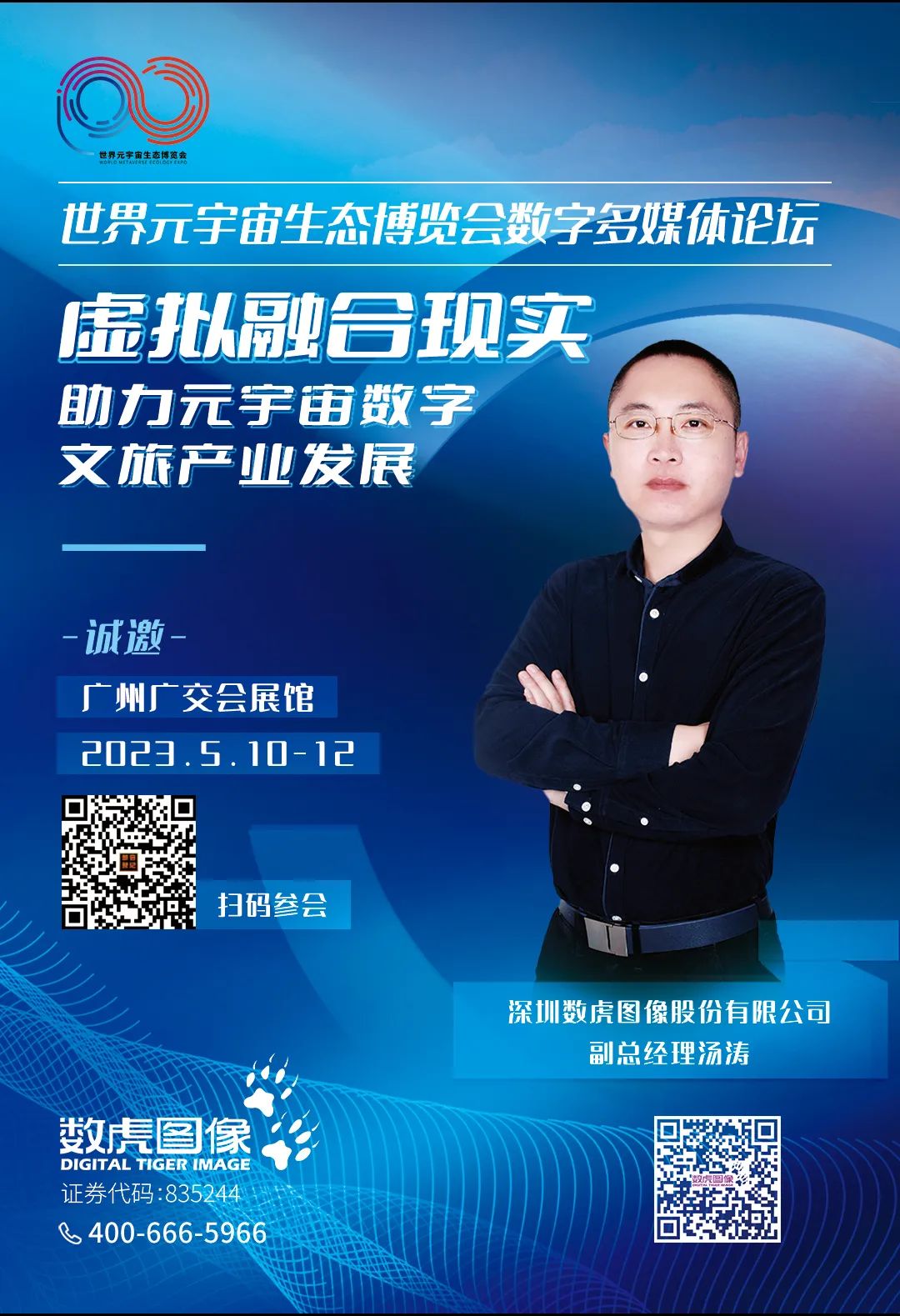 为进一步深化产业贸易与合作,整合多元化载体,以更加积极高效的方式推动元宇宙及相关生态企业、供应链等从概念刺激需求阶段迈向应用场景示范阶段,打造元宇宙产业高地及全球数字变革高地提供有力支持,由广东鸿威国际会展集团有限公司、广州市虚拟现实行业协会主办,广州鸿威数字视觉会展有限公司承办的2023第2届世界元宇宙生态博览会将于2023年5月10—12日在广州广交会展馆举办。深圳数虎图像股份有限公司展位设在广交会展馆 A 区 4.2号馆B209,欢迎大家莅临。