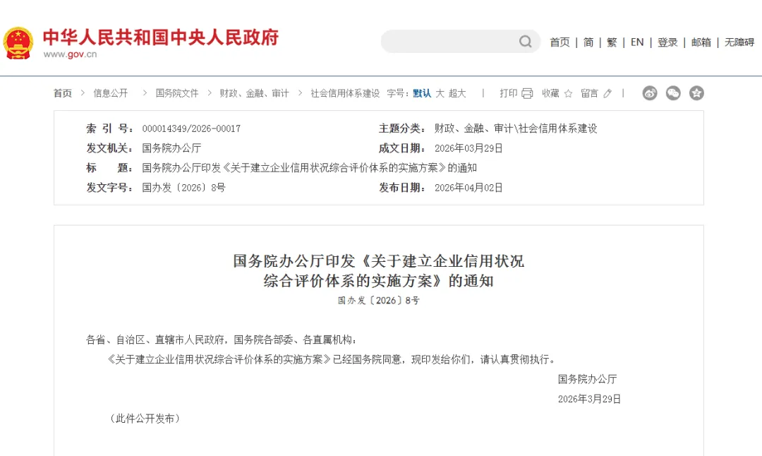昨日,国务院办公厅印发《关于建立企业信用状况综合评价体系的实施方案》(以下简称《实施方案》)。