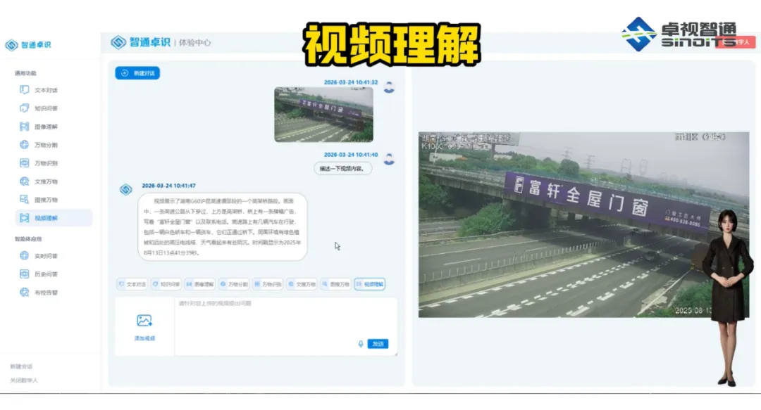 北京卓视智通科技有限责任公司(以下简称“卓视智通”)发布的“智通卓识”多模态大模型4.0,集成了数字人交互和语音识别技术,支持实时对话、历史追溯、布控预警等功能,为高速行业从业者打造了一个可私有化部署的AI助手,用户可采用类似于与“豆包”聊天的方式全览道路交通状况,可大幅提高行业从业人员的日常运维管理与应急处置效率。为满足不同行业场景的智能化需求,基于“智通卓识”通用大模型,针对高速公路、公安交管等业务场景输出交通全域态势感知大模型、交管场景大模型等行业定向大模型,从而提供更精准、更高效的行业解决方案。