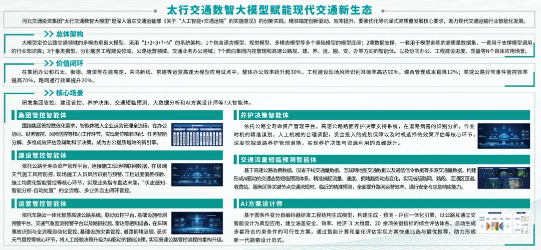 二是“人工智能+交通运输”成为行业转型的核心驱动力。AI技术正在与交通场景深度融合,推动路网管控、感知监测、决策调度从“被动应对”向“主动智能”转变。从“卓识”大模型到“山高·知行”大模型,从“太行”大模型到星辰交通大模型,从多模态融合感知到智能体全链路闭环,AI逐步渗透到高速公路“建、管、养、运、服”各个方面。