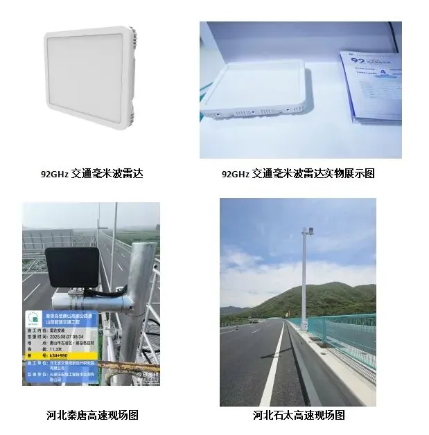 河北省交通规划设计研究院有限公司展出的92GHz交通毫米波雷达也成为该领域的代表性产品。本次参展执行单位京雄云控(北京)智能交通科技有限公司(以下简称 “京雄云控”)现场负责人介绍,该产品核心芯片已更新5代,2023年首发国产化方案,2024年率先实现规模化量产与落地应用,目前完成了河北石太、秦唐高速百公里全线布设。