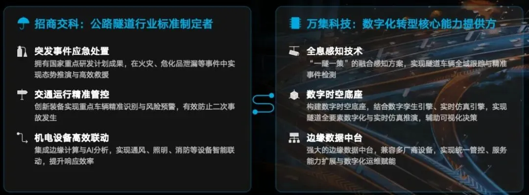 招商交科与万集科技携手发布新一代隧道数字化解决方案,采用云—边—端协同架构,构建“全息感知—融合分析—智能决策—协同执行”的闭环体系,实现从精准感知、高效决策到快速执行的全流程智能化,据了解该方案已在全国多个重点隧道项目实现规模化落地。