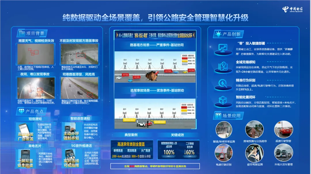 中国电信带来的基于无线信令的高速异常事件AI监测系统,依托运营商现有移动通信网络,无需任何路侧土建施工,开箱即用。系统通过AI算法拟合终端移动轨迹,孪生车辆行驶行为,实现7×24小时全天候监测,精准识别高速异常停车、龟速行驶、疲劳驾驶等事件,并具备精准触达涉事司乘人员的能力,有效降低二次事故风险。同时,在手机支付等场景下,系统可还原车辆行驶轨迹,目前在武深高速新博路段成功应用,从发现事件到处置能在5分钟内实现闭环,全面赋能高速智慧安全运营。