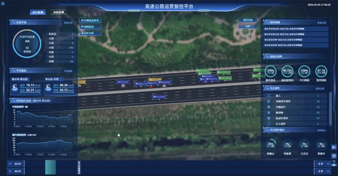 云星宇基于高精一张图的运营智控平台,以全要素数字孪生实现物理世界数字化动态感知,打通监控、养护、收费、机电、应急、服务六大业务领域,破除数据与业务壁垒,通过大数据融合分析支撑跨域协同精准决策,推动高速运营从经验驱动转向数据模型驱动,赋能政企民三方。