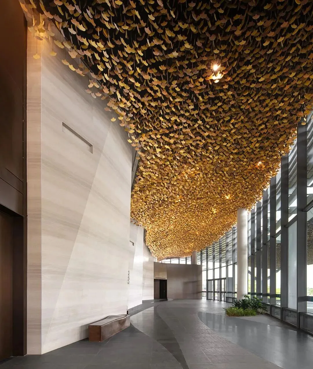 △ 木纹石与金属银杏叶片、古铜色铝板的组合©404NF STUDIO