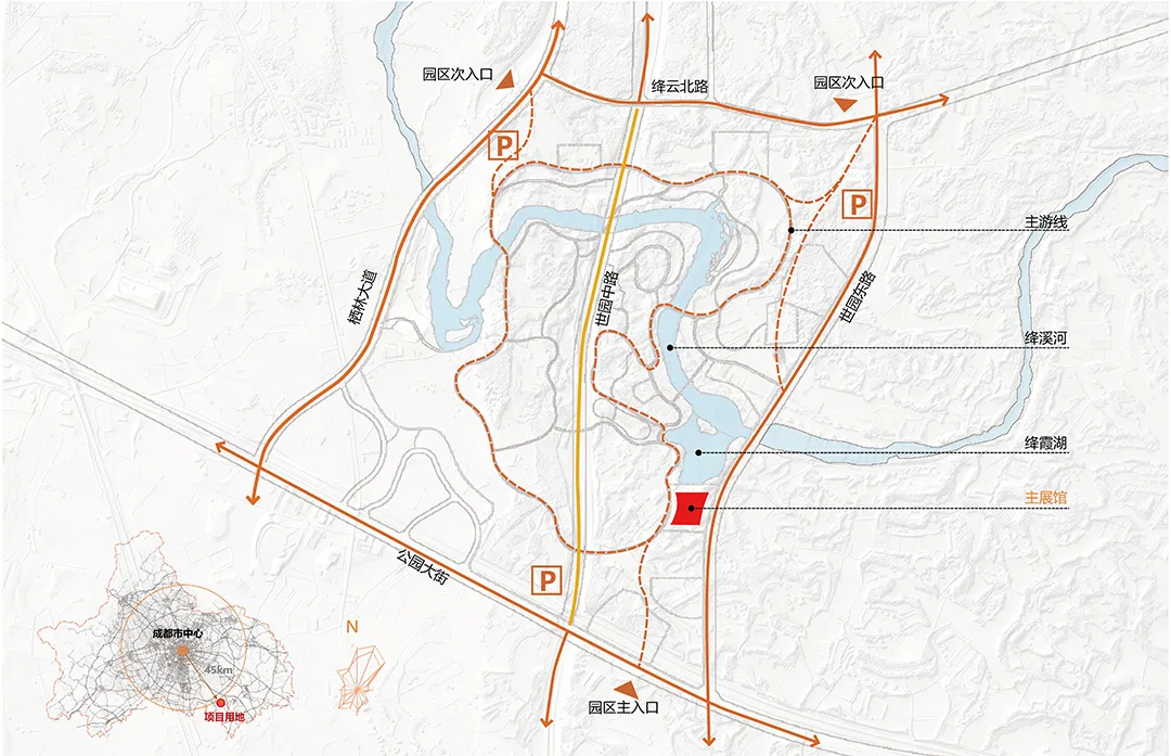 2024年成都世界园艺博览会主展馆坐落于成都东部新区,北临绛霞湖,南倚自然浅丘,西临园区内道路,东接世园东路。作为本届世园会的核心建筑,承担博览会期间的闭幕式、国际花卉竞赛展、会时论坛等重要活动功能。会后主展馆做局部功能调整,可持续作为成都东部新区文化活动中心使用。