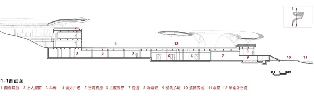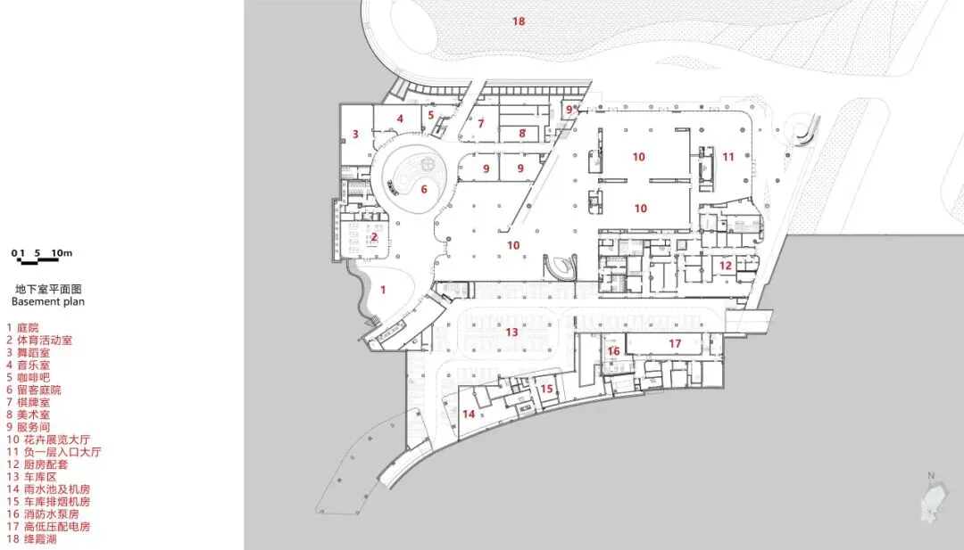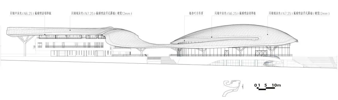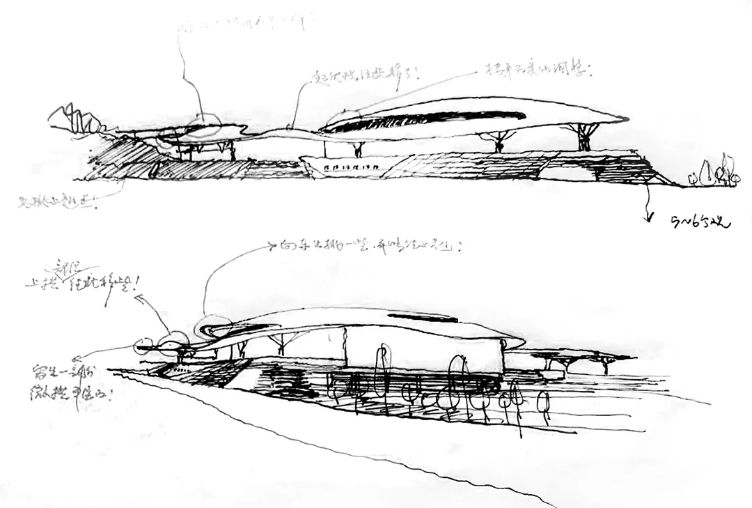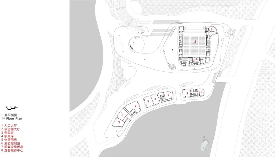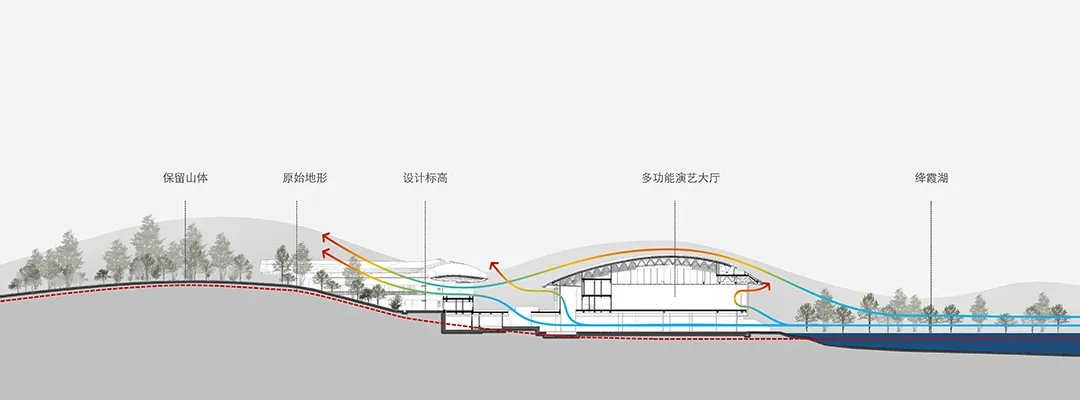 设计基于环境融合理念、尺度控制要求、滨水建筑亲水特点及对现状自然环境资源的理性分析,将约1.2万平方米的展厅、文化艺术活动、配套车库等功能滨水(绛霞湖为人工泻湖)设置于场地北侧的滨水处,节省土方填挖的同时形成北侧亲水界面,并以多级观景台阶看台过渡,形成多个不同标高的观景平台。