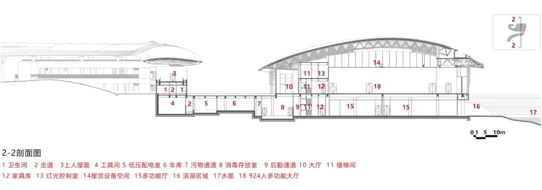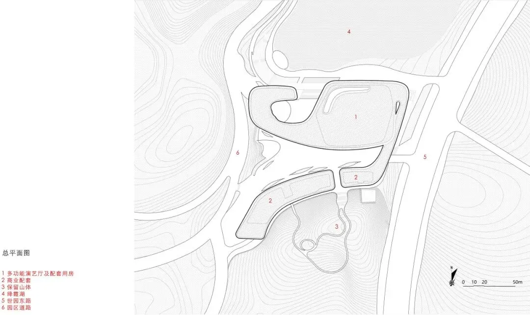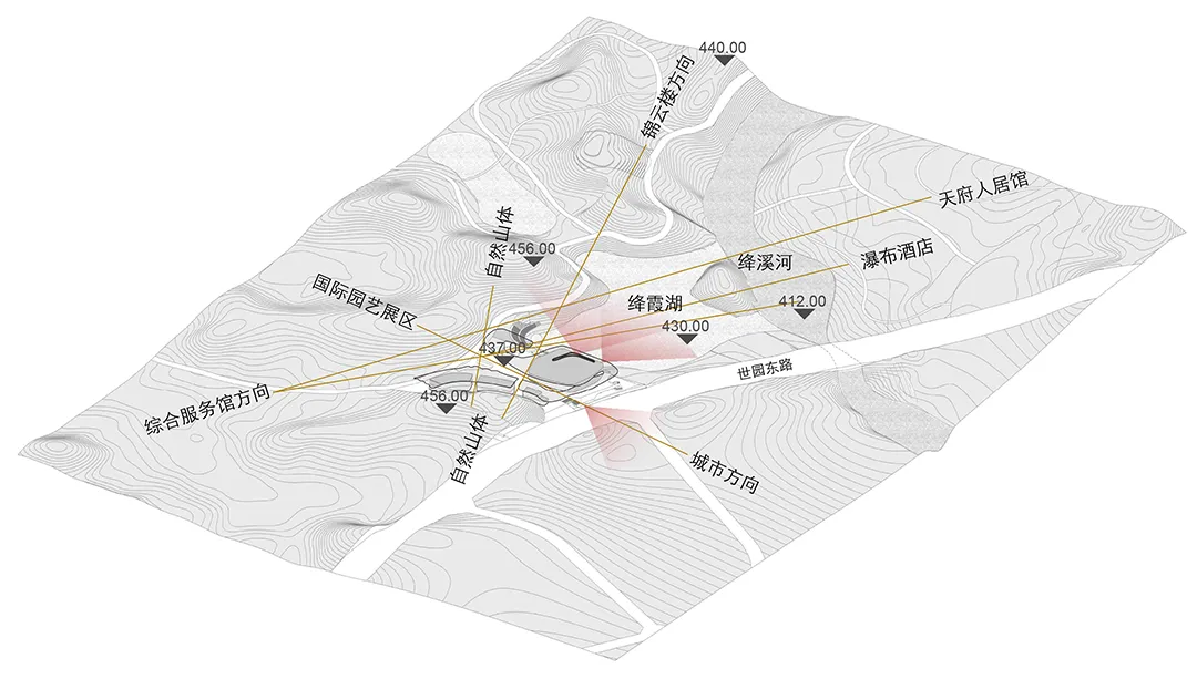 主展馆项目用地位于两山之间的浅丘谷地,北侧绛霞湖湖面最窄处仅为85米,场地内最大高差达26米。在相对狭窄的山水环境中,建筑体量无疑是一个“巨构”。