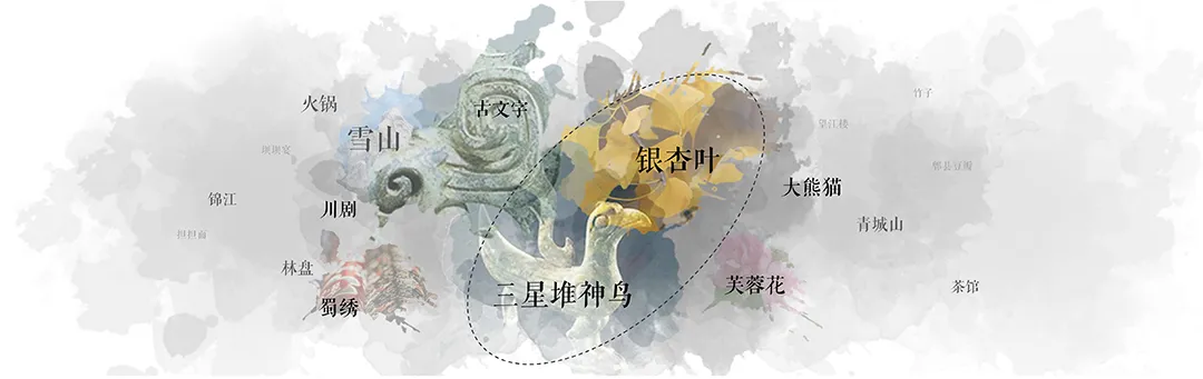 与建筑的“地域性”强调某一地理区域共享的自然人文环境共性不同,建筑的“在地性”与建筑场地所处地方的特点特征、自然环境和人文环境有着紧密相关的特性,它强调的是一种与众不同的个性特征,即独特的融入环境的方式。设计从众多关联成都人文要素的关键词入手,选取三星堆“神鸟”及市树“银杏”为人文表达元素,进行空间形式书写。