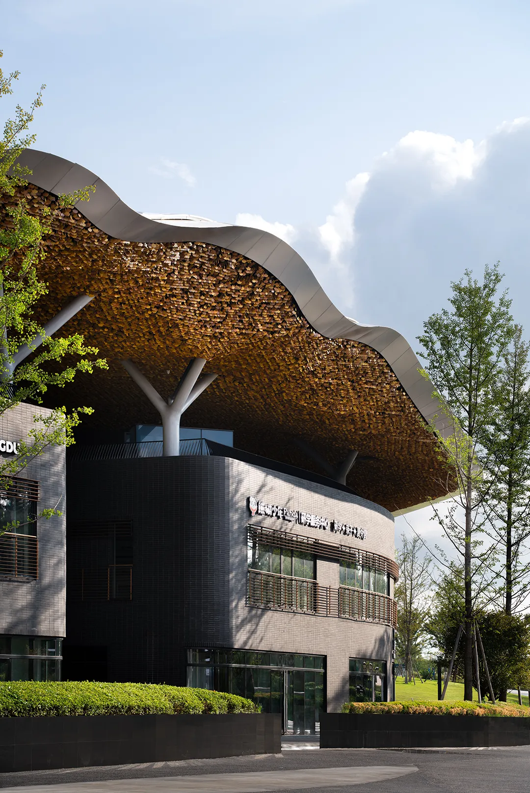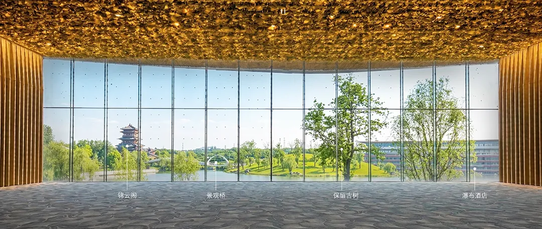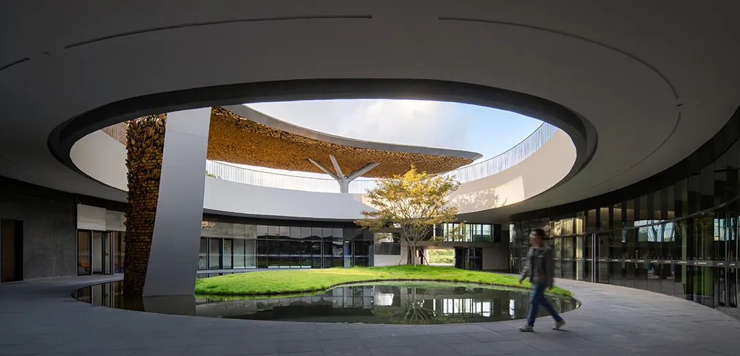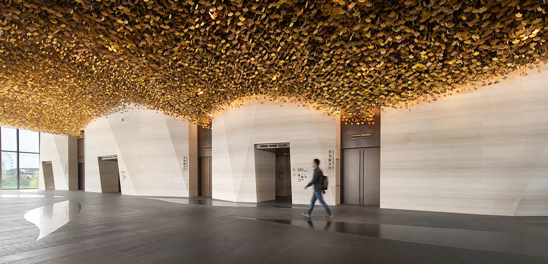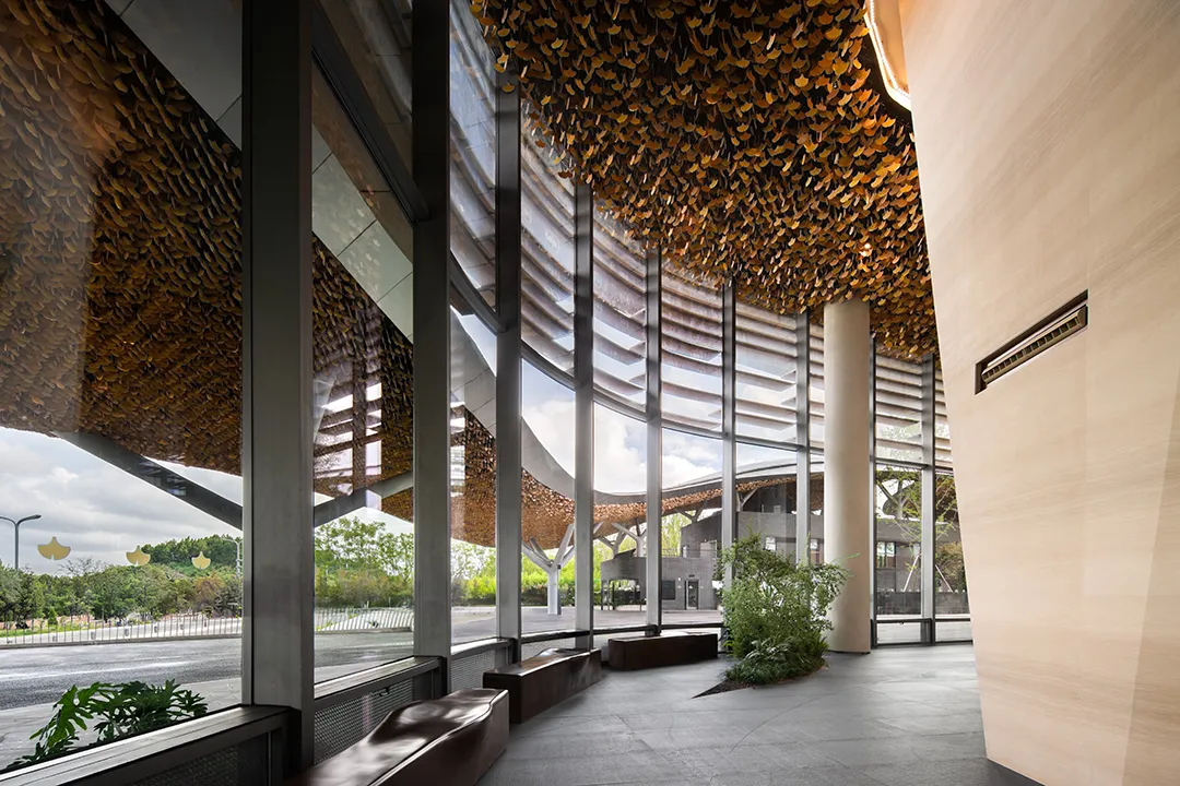 “神鸟”古拙曲线构成婉转灵动的屋顶姿态,体现“神鸟衔花”的意向;漫延室内外的“银杏天幕”以朴素的语言回应与自然的对话,在银杏树下,风动、叶动、心动,自然与人文的有机结合,给空间体验一个在地性唤醒。