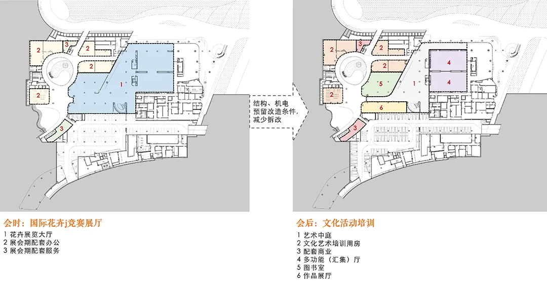建筑是动态生长的,空间柔性设计的外延效应也在变化之中。随着世园会的圆满落幕,这座建筑将回归日常,成为一座服务于市民的文化活动中心。我们相信,随着时间的流转,这座建筑将会如同它身处的自然环境一样,生长共融,和谐相生,成为城市自然与文化不可或缺的一部分。
