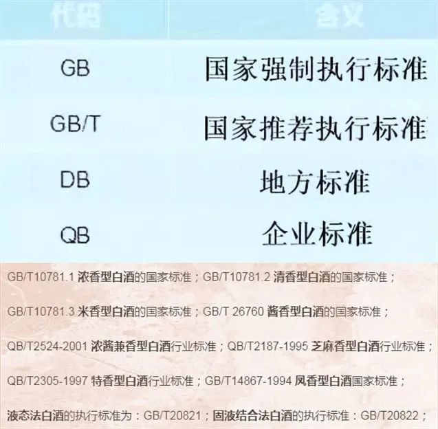 国家标准到底是什么标准,执行标准上面的一串代码到底是什么意思呢?我国白酒按国家标准可分为三类: