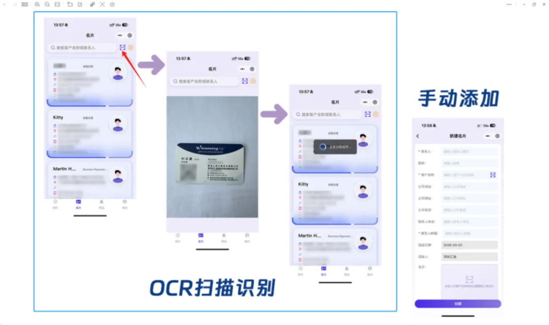 展会现场,业务员最耗时的动作是什么?是手动输入名片信息。而我们只需手机打开汇有单,一键扫描名片,客户的姓名、公司、职位、联系方式等关键信息即可自动提取,一秒钟完成建档。而且这些数据会立即同步到企业后端的CRM系统,业务员不用再熬夜录名片,可以把全部精力放在与客户的现场沟通和需求挖掘上。