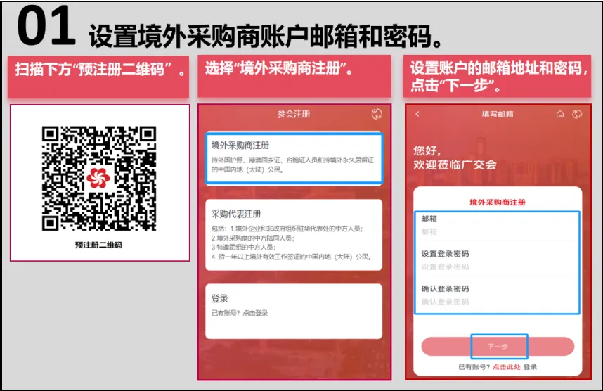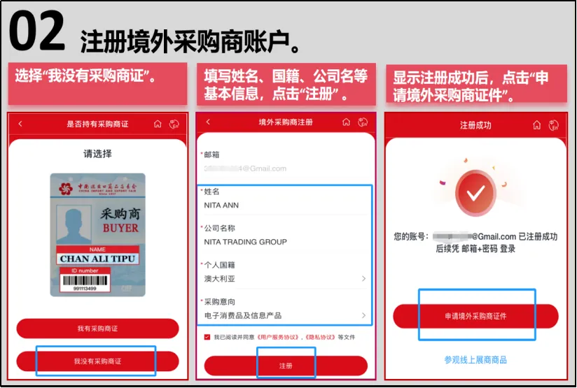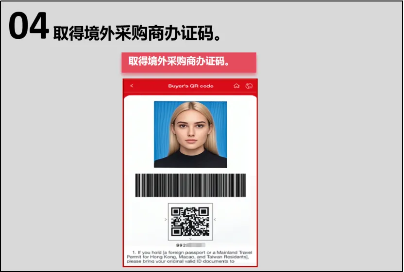 第一步 完成预注册,取得境外采购商办证码。 ![]() ![]() ![]() ![]() 第二步 办理境外采购商证。 持有外国护照、港澳居民来往内地通行证、台湾居民来往大陆通行证等证件原件,且已取得采购商办证码的客商,可通过以下两种方式办理: 1.自助打证机办理。客商将个人身份证件的信息页放置在机器的感应区,即可快速完成证件识别审核,审核通过后办理证件。 2.人工办理。客商持个人身份证件原件和采购商办证码前往人工柜台办理证件。 持有中国护照+境外永久居留证/签证原件的客商请直接前往人工柜台审核身份证件。 |