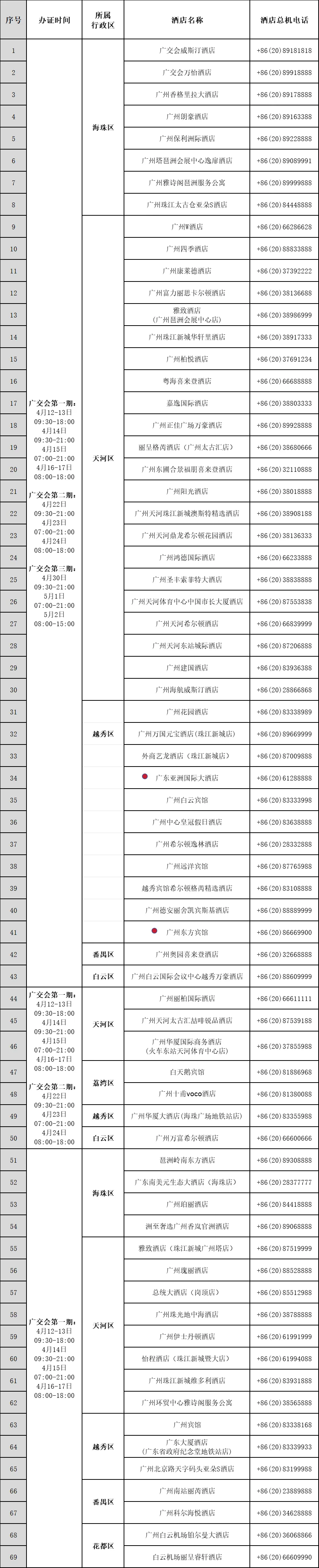 广交会办证地点划分为远端办证点和展馆办证点,两类办证点受理不同类型的证件办理: (一)境外采购商报到处(远端办证点)。 1.受理对象:仅受理持有外国护照、港澳居民来往内地通行证及台湾居民来往大陆通行证的客商办理采购商证。持有中国护照原件+境外永久居留证原件/永居签证原件的客商须前往展馆办证点办理证件。 2.办证地点和办证时间: 广州白云国际机场办证点 地址1:T1航站楼国际到达厅A7出口 办证时间:4月12日至5月2日8:00-24:00 地址2:T2航站楼国际到达厅临时柜台 办证时间:4月12日至5月2日 08:00-24:00 夜间办证:4月14—15日、22—23日、4月30—5月1日24:00-次日8:00 广州南站办证点 地址:广州南站一层东门、西门服务台 办证时间:4月13—16日、21—24日、4月30日—5月2日10:00-21:00 琶洲港澳客运口岸办证点 地址:广州琶洲港澳客运口岸三楼入境处 办证时间:4月14—18日、22—26日、4月30日—5月2日10:00-20:00 广交会香港办事处办证点 地址:香港湾仔港湾道1号会展广场办公大楼3106-3107室 办证时间:全年工作日10:00-12:30;14:00-17:00 广交会指定69家办证酒店办证点(详细信息附后)。 (二)境外采购商报到处(展馆办证点)。 1.受理对象。所有类别的境外采购商及采购代表。 2.日间办证地点和办证时间: 境外采购商报到处(D区) 地址:广州地铁8号线新港东站A出口 境外采购商报到处(B区) 地址:广州地铁8号线/11号线琶洲站A/B出口 境外采购商报到处(C区) 地址:广州地铁8号线/11号线琶洲站C出口 办证时间: 3.夜间办证地点和办证时间: 境外采购商报到处(C区) 4月12-14日18:00-次日07:00 |